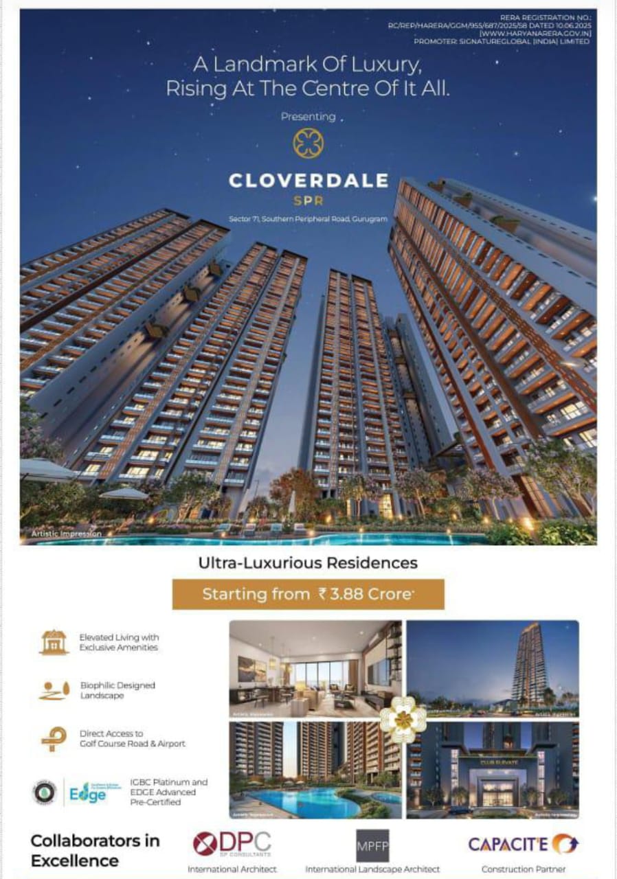 Signature CloverDale a pre-launch premium residential development located on the prominent SPR Road in Sector 71, Gurugram. Spanning across 8 acres, the project offers a harmonious blend of contemporary architecture, expansive green spaces, and high-end lifestyle amenities β all thoughtfully planned for refined urban living.